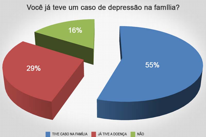 Ao todo, 84% dos internautas do Canal Içara já tiveram um caso de depressão na família. Desse valor, 29 pontos percentuais correspondem a leitores que tiveram a doença. Os dados da enquete foram coletados entre os dias 14 e 21 de março. Participaram 58 usuários, espontaneamente, através da capa do portal.