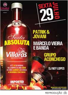 Até 1h, na compra de uma dose ou garrafa de vodka, a segunda será na faixa. Isto é o que promete a Festa Absoluta, na margem da SC-444, onde está o Villaras. A balada será nesta sexta-feira, dia 29.