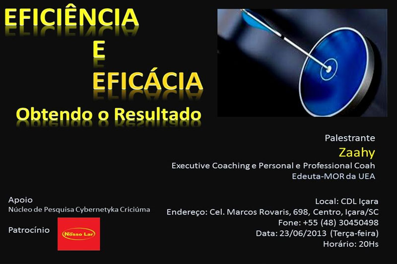 Eficiência, eficácia e resultados são temas centrais de uma palestra em Içara nesta terça-feira, dia 23. Zaahy é professora, conferencista, coaching executiva e psicoterapeuta. Atua também como Edeuta-MOR e, através do método Mak’ Gregor, estimula o autodidatismo. O evento com ela acontecerá no auditório da Câmara de Dirigentes Lojistas a partir das 20h com apoio do Núcleo de Pesquisa Cybernetyka Criciúma e o patrocínio da Loja Nosso Lar. A entrada é gratuita.