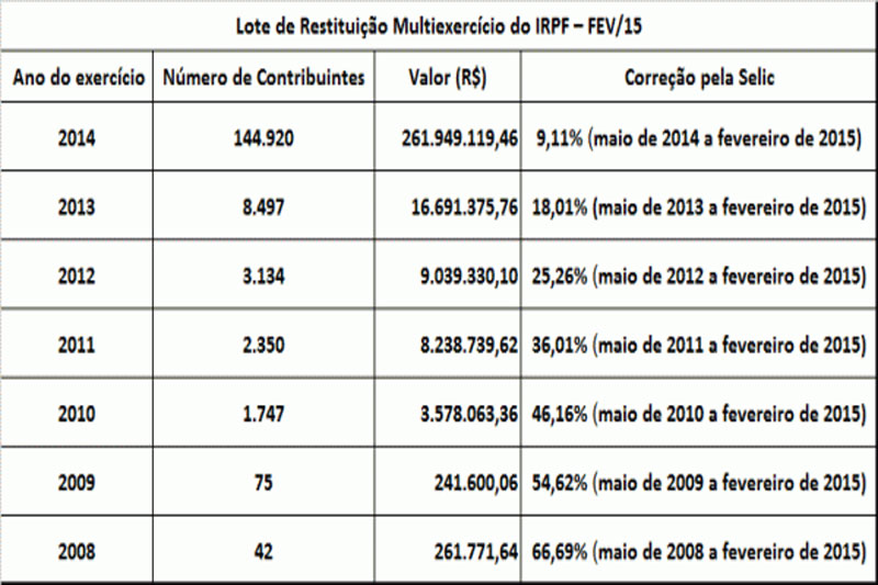 As restituições terão correção de 9,11%, relativa às declarações de 2014, a 66,69%, para as declarações de 2008. Os índices equivalem à taxa Selic acumulada desde o mês de entrega da declaração. A relação dos contribuintes está disponível na Internet (www.receita.fazenda.gov.br), pelo telefone 146 ou nos aplicativos para tablets e smartphones.