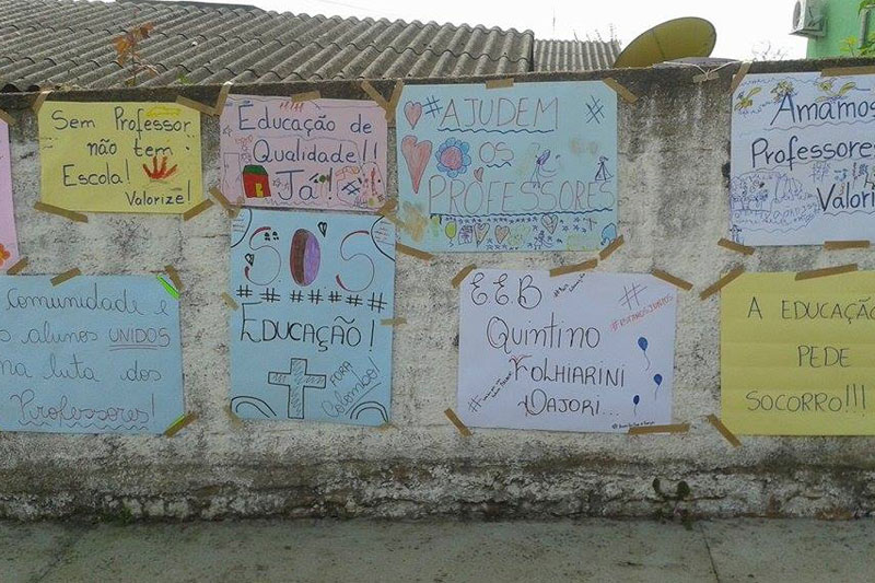 Os alunos da Escola Quintino Folhiarini Dajori no bairro Presidente Vargas criaram cartazes em defesa dos professores e colocaram nos muros da unidade estadual nesta terça-feira, dia 24. A manifestação é devido às mudanças na carreira do magistério propostas pelo Governo. Entre as alterações está a incorporação da regência e a desvinculação dos profissionais admitidos em caráter temporário da tabela de vencimentos dos efetivos.