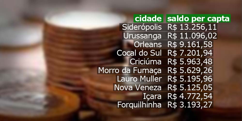 Os içarenses atingiram R$ 270 milhões na poupança. O número até parece estrondoso, mas a cidade está bem distante na comparação per capta com outros municípios da Região Carbonífera. O saldo representa R$ 4,7 mil por habitante. Apenas Forquilhinha figura atrás, com R$ 3,1 mil. Em primeiro lugar, por vez, Siderópolis apresenta o equivalente a R$ 13,2 mil aplicados na poupança para cada morador.