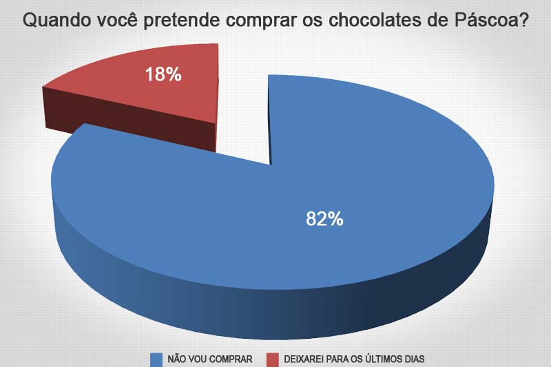 Uma das referências da Páscoa, o chocolate não aparece mais entre as prioridades desta data. Ao menos é o que aponta a enquete mais recente do Canal Içara. Dentre 57 participantes de 15 a 22 de fevereiro, 82% apontaram que não vão comprar. Outros 18% indicaram que deixarão para os últimos dias. E nenhum internauta apontou pressa para a aquisição logo que as prateleiras e parreiras forem preenchidas pelos artigos.