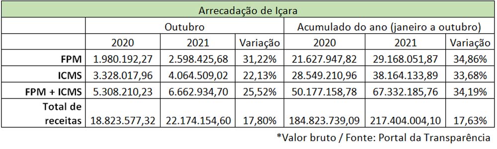 Seguindo em tendência de alta, a arrecadação de Içara já superou os números de 2020 em duas de suas principais receitas: o retorno do Imposto Sobre Circulação de Mercadorias e Serviços (ICMS) e os repasses do Fundo de Participação dos Municípios (FPM). No geral, até outubro foram arrecadados R$ 217.404.004,10 (em valores brutos), o equivalente a 93,21% do total de receitas do ano passado, quando o montante ficou em R$ 233.235.552,22 na soma dos 12 meses.