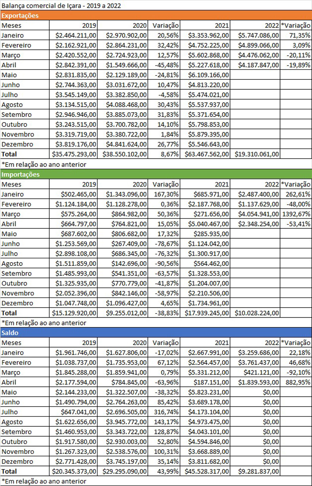 No acumulado do ano, o volume negociado por empresas içarenses ao exterior soma US$ 19.310.061, ligeiramente superior (1,97%) aos US$ 18.936.673 exportados entre janeiro e abril de 2021.