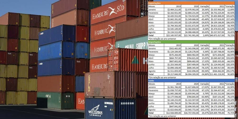 O salto nas importações foi ainda maior, passando de US$ 6.004.309 na soma dos oito primeiros meses do ano em 2020 para US$ 11.461.218 este ano, alta de 90,88%. No entanto, a variação do superávit alcança 75,71% entre um ano e outro. Em 2020, ficou em US$ 16.737.592, enquanto este ano está em US$ 29.409.799 no acumulado entre janeiro e agosto, devido ao momento favorável às exportações.