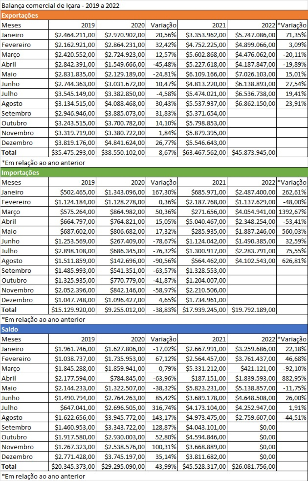 No mês de agosto, o volume exportado por empresas içarenses chegou a US$ 6.862.150, o segundo maior para um mês na série histórica, atrás apenas dos US$ 7.026.103 alcançados em maio deste ano. Já as importações contabilizaram US$ 4.102.543, resultando em superávit de US$ 2.759.607.