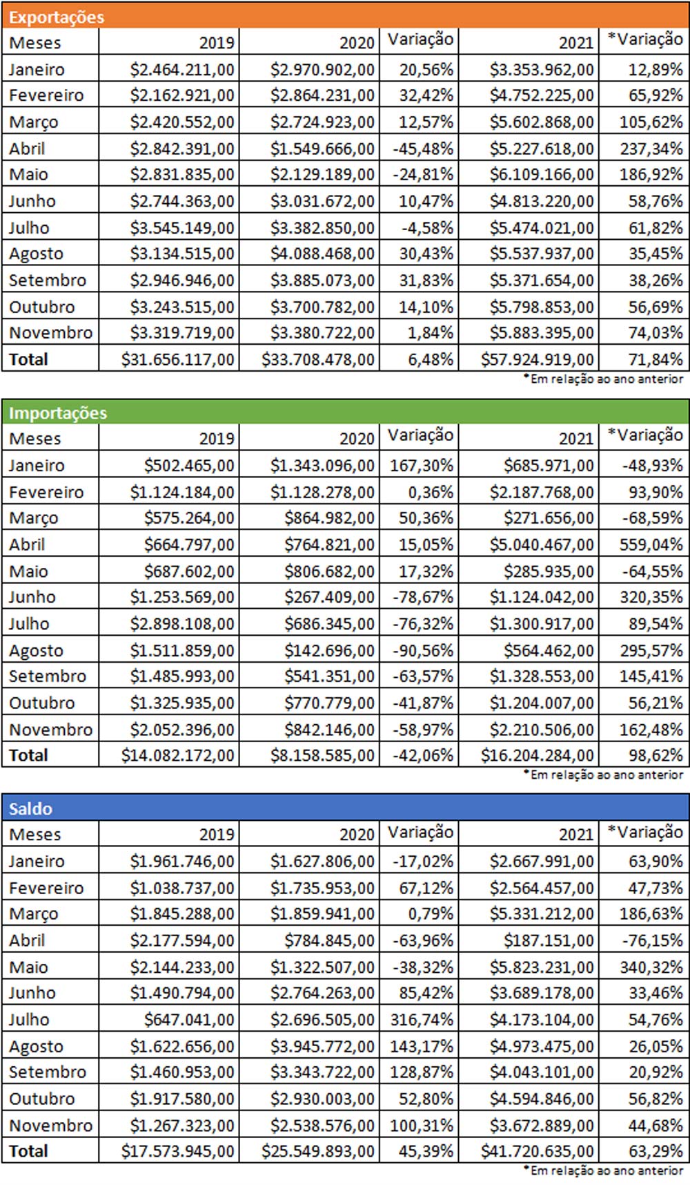 Esse aumento verificado na comparação com 2020 acabou sendo determinante para manter a balança comercial em superávit, pois as importações quase dobraram entre um ano e outro. De janeiro a novembro, o volume importado foi de US$ 16.204.284, 98,62% acima dos US$ 8.158.585 registrados no mesmo período do ano passado e superando também os US$ 14.082.172 de 2019, ano pré-pandemia.