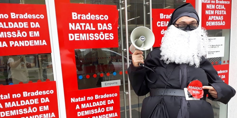 Bancários protestaram em frente a agência do Bradesco de Içara com um saco preto sem bons presentes nesta quinta-feira, dia 26. A manifestação alusiva a um triste Natal foi realizada devido a demissões e metas consideradas abusivas pela categoria.