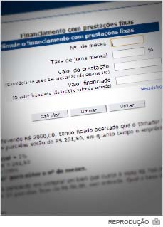 Uma delas é aplicação com depósitos regulares, que permite simular os rendimentos de um investimento, ao informar a taxa de juros e o período em que serão feitos os depósitos regulares. Na opção financiamento com prestações fixas, o consumidor pode obter o valor financiado, a taxa de juros, o prazo e o valor da prestação. Para isso, será preciso digitar três dessas informações.