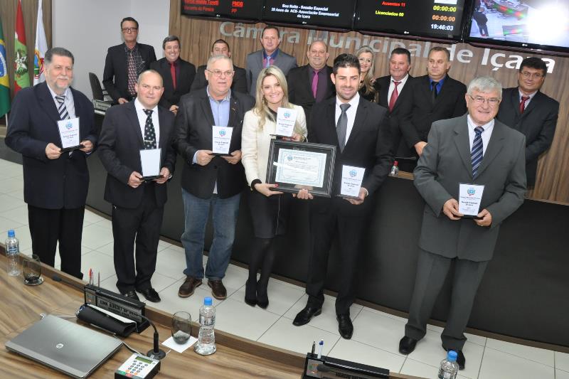 O reconhecimento pelos 20 anos de atividade da Associação Empresarial de Içara se materializou em sete troféus nesta quinta-feira, dia 28. A honraria preparada pela Câmara Municipal foi destinada ao presidente Filipe Pavei e também aos ex-ocupantes do cargo, Ramiro Cardoso, Sandro Giassi Serafin, Agenor Sartori Castagna, Aldo Wagner Fernandes, Adalberto Pizzetti e Joi Luiz Daniel em sessão especial convocada por Márcio Dalmolin (PSD). “A Acii é formada por pessoas dedicadas. Esta é a forma de parabenizarmos todos que fizeram parte dessa história”, ressalta o presidente da Câmara Municipal de Içara, Márcio Realdo Toretti (PMDB).