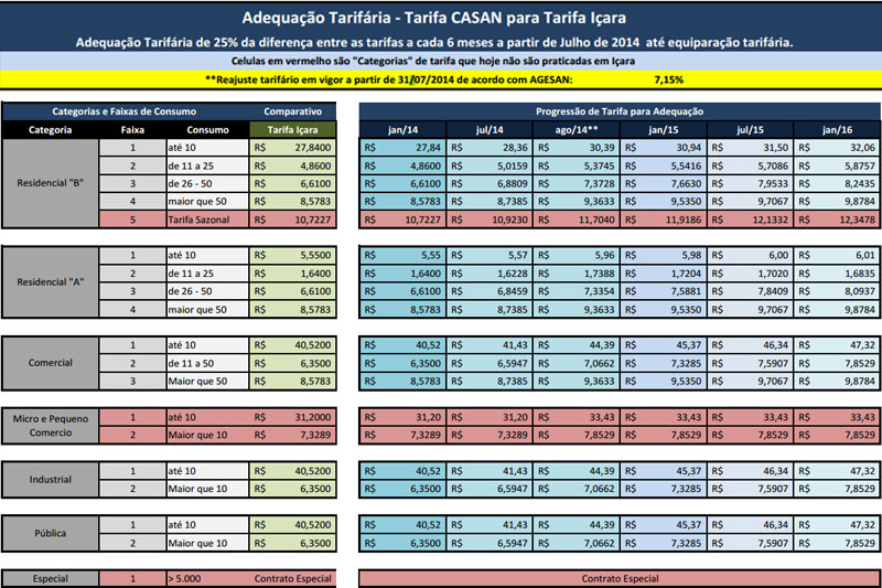O acréscimo faz parte da readequação programada na transferência da distribuição até então feita pelo Sistema Autônomo Municipal de Água e Esgoto. Os reajustes continuarão em janeiro e julho até 2016. Além da tabela residencial, o acréscimo também atinge as categorias Comercial, Industrial e Pública. A nova gestão implantou a tarifação também para micro e pequeno comércio, além da especial para quem adquire mais de 5 mil metros cúbicos.