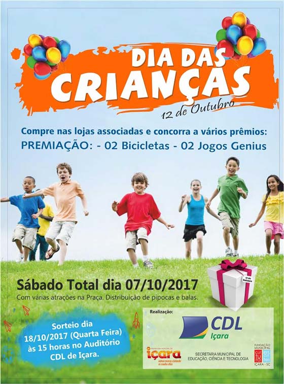 As compras realizadas no comércio de Içara até o dia 11 de outubro concorrerão a duas bicicletas e dois jogos Genius. Para participar da promoção do Dia das Crianças da Câmara de Dirigentes Lojistas de Içara basta requisitar o cupom numa das 250 lojas associadas identificadas com o cartaz da campanha. "Além dos sorteios no dia 18, teremos uma festa na praça das 9h às 17h do dia 7 de outubro com apresentações escolares, brincadeiras e também distribuição de pipoca para toda a família", coloca o presidente Alexandre Fernandes.