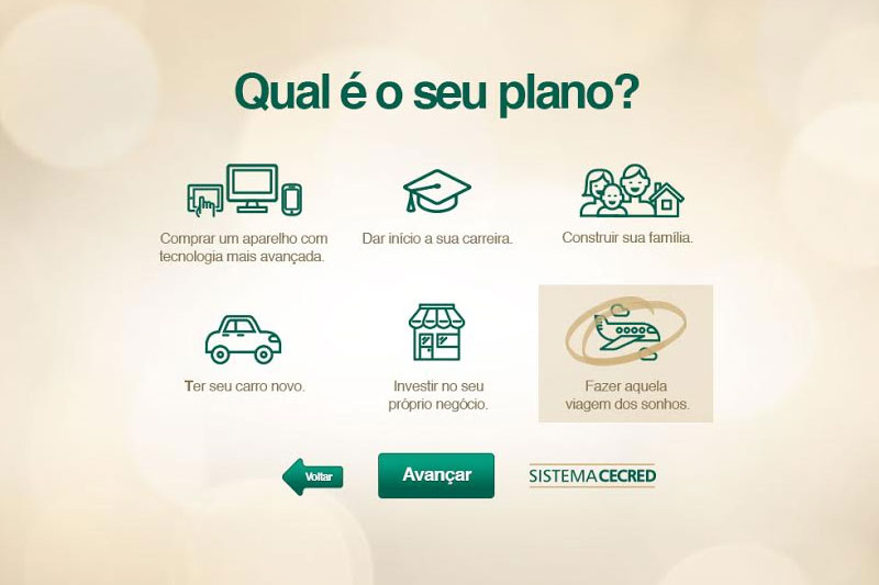 Aplicando parte da renda mensal é possível alcançar sonhos e planos para o futuro. Mas isso exige planejamento. As simulações para compras, carreira, família, automóveis, negócios e viagens podem ser feitas através do site www.ofuturocomecaagora.com.br lançado pelo sistema Cecred. Basta preencher o valor total e quanto pode aplicar mensalmente para saber quando será possível alcançar o objetivo.