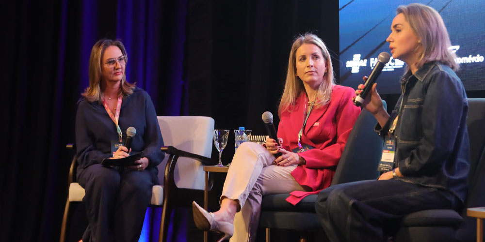 O segundo painel da noite destacou a importância da gestão estratégica como base para o crescimento sustentável das empresas, com Grasiela Moretto, da Ufo Way, Monique Pizzetti, do Super Moniari, sob a mediação de Mila Casagrande, coordenadora do Núcleo de Mulheres Empreendedoras de Içara. “Cuidamos das pessoas e também produzimos roupas”, definiu Grasiela, reforçando o papel humano na indústria têxtil. “Geramos o bem-estar familiar todos os dias!”, completou Monique, representante do setor supermercadista.