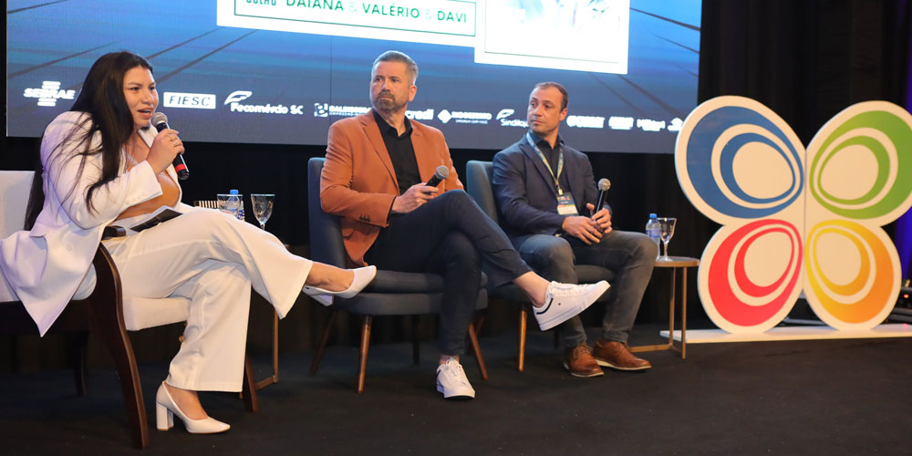O primeiro painel realizado no Rhois Centro de Eventos mergulhou no setor industrial, propulsor de transformação e inovação, com a participação de Valério Serafim, da Benjamin Kombucha, Davi Oliveira, da Atom Robótica, sob a mediação de Daiana Bressan, coordenadora do Núcleo Empreendedor de Içara. “Inovar é transformar ideias em ações e impacto. Empreender é ter coragem de começar antes que tudo esteja pronto”, lembrou Davi. “O propósito, a persistência e a coragem levam você a excelência”, completou Valério.