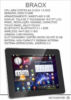 O PRODUTO - Foi depois de visitar uma feira internacional em Las Vegas, e constatar que o tablet seria a próxima tendência do mercado de tecnologia, que a Aiox decidiu apostar na criação de seu próprio produto. Da ideia inicial, foram nove meses de testes e desenvolvimento e cinco protótipos até chegar ao equipamento ideal. Com 11 milímetros de espessura e 315 gramas, o Braox é produzido em alumínio. Tem tela de sete polegadas, 512 MB de memória, Bluetooth, wireless e câmera com dois megapixels. Utiliza processadores da linha Cortex e o sistema operacional Android. A bateria dura nove horas.