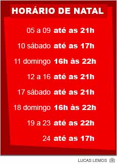 A partir da segunda semana de dezembro o comércio prolongará o expediente em atenção ao Natal. Entre os dias 5 e 9, além de 12 a 16, as portas ficarão abertas até às 21h. De 19 a 23, o funcionamento acontecerá até as 22h. Já na véspera da comemoração, os atendimentos voltarão ao normal. Serão até as 17h.