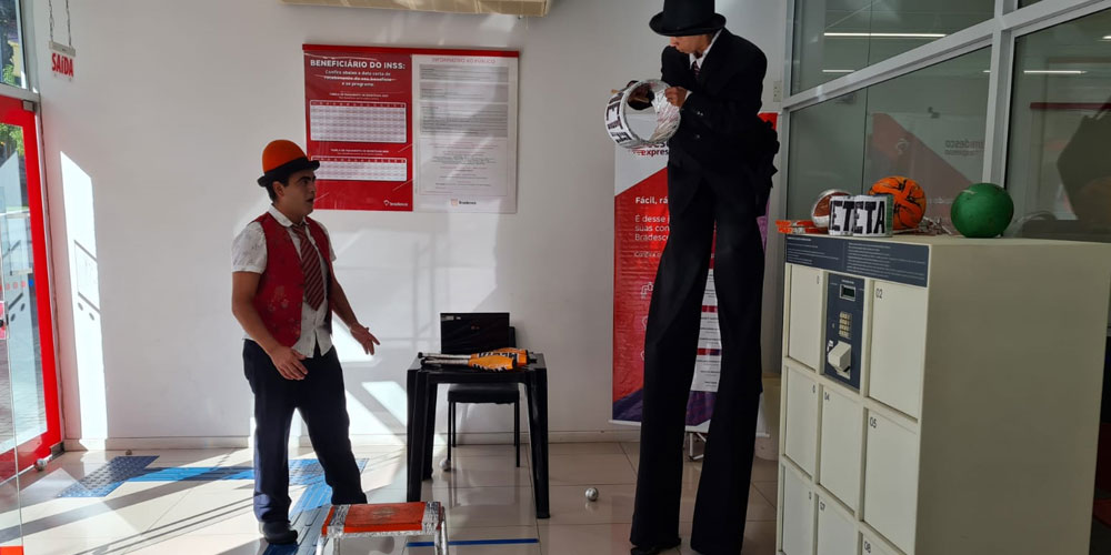 Uma esquete teatral foi realizada em uma instituição bancária privada em Içara na manhã desta quarta-feira, dia 31. O protesto promovido pelo Sindicato dos Bancários de Criciúma e Região teve um banqueiro perna de pau e um funcionário malabarista- equilibrista para dar conta das metas cobradas pelo patrão. O texto levado para dentro do Bradesco fez crítica a cobrança abusiva de metas e o adoecimento dos trabalhadores.