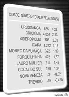 Já em números absolutos, a ordem é outra. Criciúma se mostra campeã com a criação de 4,8 mil postos de trabalho. E, Içara fica deste modo com a prata. Foram 1,2 mil pessoas empregadas no último ano. Num panorama nacional, acabou em 316º lugar. Os dados são do Cadastro Geral de Empregados e Desempregados (Caged).