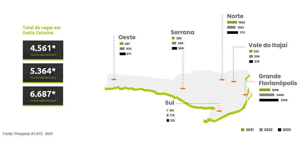A Acate realizou o mapeamento com as empresas de tecnologia de Santa Catarina e 228 delas responderam formalmente. Com apoio de professores da Universidade Federal de Santa Catarina (UFSC), foi feita a extrapolação dos dados. Segundo as estatísticas, as funções mais demandadas são Desenvolvedor Full Stack, Back-end e Front-end, seguidas por analista de serviços/suporte TI e analista de negócio.