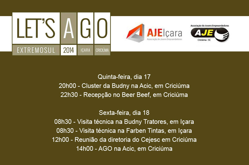 Os jovens empreendedores de Içara e Criciúma sediarão pela segunda vez a assembleia geral ordinária do conselho estadual, o Cejesc, entre 17 e 18 de julho. Até agora já são mais de 60 inscrições de todas as regiões catarinenses. E com a proximidade do evento, a tendência é que o número chegue a dobrar. Aos interessados, as vagas estão abertas pelo site www.cejesc.org.br. O evento iniciará com a apresentação do cluster idealizado pela Budny Tratores. Na sexta-feira terá ainda uma visita técnica na empresa, além de uma aula de gestão na Farben e a formação do network entre os participantes.