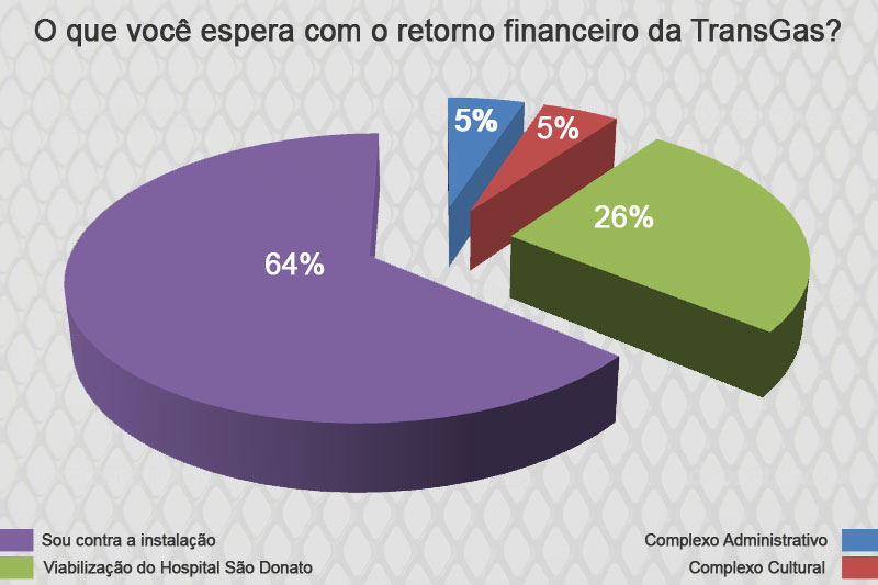 No caso da instalação da TransGas em Içara, qual poderia ser o melhor retorno financeiro para a cidade? Para 5% dos leitores do Canal Içara a contribuição da empresa deveria ser a construção de um Complexo Cultural. Outros 5% opinaram pela edificação de um novo completo administrativo. A viabilização do Hospital São Donato atingiu 26%. Mas a maior porcentagem foi em contrariedade a carboquímica, neste caso, com 64%. Ao todo votaram 229 internautas na enquete do portal ao longo de 42 dias: de 28 de julho a 8 de setembro de 2014.