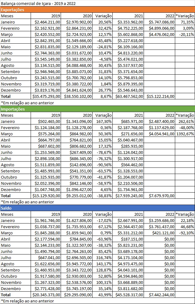 As exportações realizadas por empresas içarenses totalizaram US$ 15.122.214 no primeiro trimestre deste ano, o que representa aumento de 10,31% em comparação aos US$ 13.709.055 somados no primeiro trimestre de 2021. Os dados são do sistema Comex Stat, disponibilizado pelo Ministério da Indústria, Comércio Exterior e Serviços.