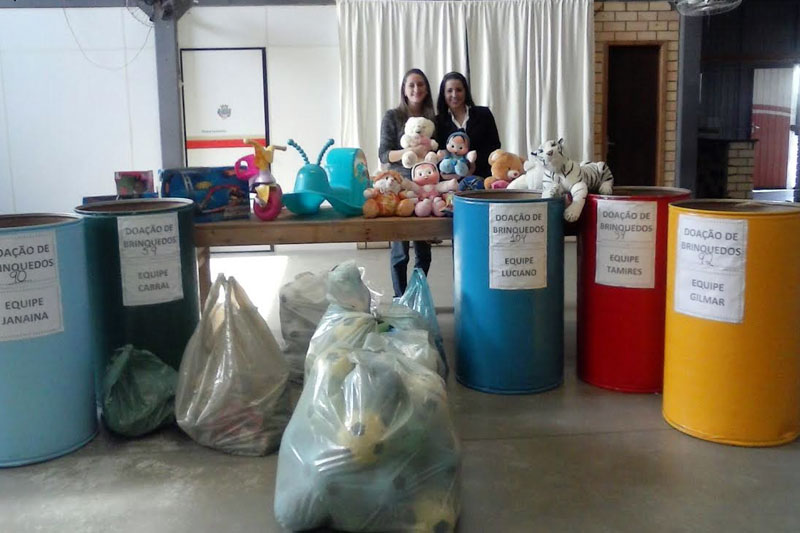 Brinquedos foram doados pelos colaboradores da Farben nesta semana para o Natal da Família Feliz. A campanha de arrecadação continuará até o dia 10 de dezembro com pontos de coleta no setor de Fomento às Atividades Inclusivas do Município, Fundai, Paço Municipal, Giassi Supermercados, Rádio Difusora, nos cartórios de notas e registros ou na sede da Família Feliz. Já a festa para a entrega dos presentes, cestas básicas e doces será no dia 19.