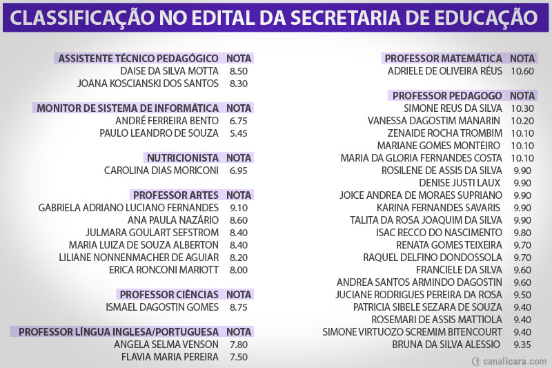Na relação do Canal Içara constam os candidatos que ficaram dentro do número de vagas. A lista completa, por vez, está em icara.fepese.org.br. Os participantes terão o dia 19 e 20 para recorrer. As respostas serão divulgadas até o dia 26 e no mesmo dia acontecerá a apresentação do resultado final. Os candidatos a vaga de agente de serviços gerais terão ainda a prova de aptidão física no dia 22 de fevereiro. Neste caso, o resultado será reapresentado no dia 15 de abril.