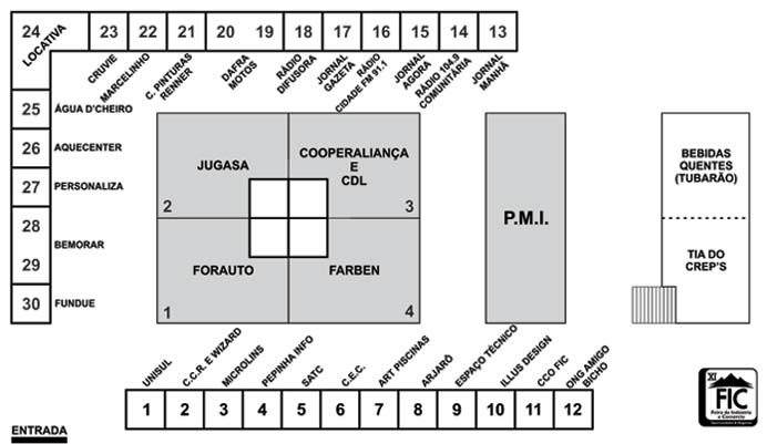 No corredor próximo da Rua Anita Garibaldi, estarão lado a lado o Jornal da Manhã, Rádio Cidadania Digital (104,9 FM), Jornal Agora, Rádio Cidade (91,1 FM), Jornal Gazeta, Difusora (AM 510), Dafra Motos, Centro de Pinturas Renner, Marcelinho, Cruvie e, na esquina, a Locativa. Ainda garantiram a exposição de produtos e serviços a imobiliária Bemorar, Personaliza, Aquecenter, Água de Cheiro e Fondue.
