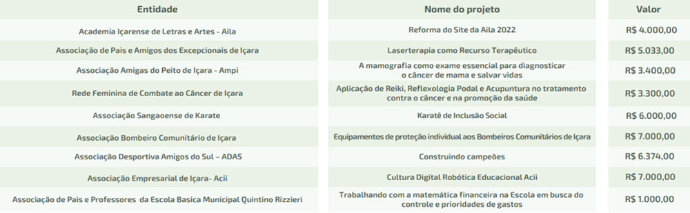As iniciativas na cidade serão executadas para atender Objetivos para Desenvolvimento Sustentável elencados pela Organização das Nações Unidas. Foram selecionados projetos da Academia Içarense de Letras e Artes, Associação de Pais e Amigos dos Excepcionais, Associação Amigas do Peito de Içara, Rede Feminina de Combate ao Câncer, Associação Sangaoense de Karate, Associação Bombeiro Comunitário, Associação Desportiva Amigos do Sul, Associação Empresarial e Associação de Pais e Professores da Escola Basica Municipal Quintino Rizzieri.