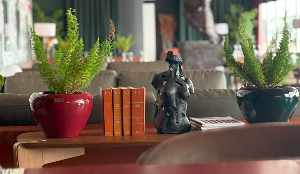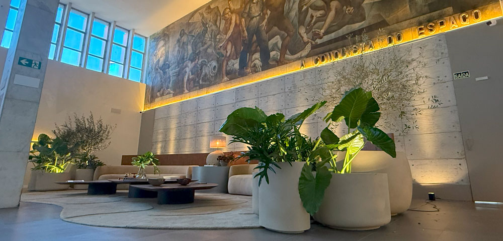 "Os vasos vieram de encontro exatamente ao que eu procurava, com formas orgânicas e com as tonalidades exatas para o projeto", afirma também a arquiteta Caroline Kreling sobre a transformação do saguão do terminal no lounge A Conquista do Espaço, nome homônimo a uma das obras mais simbólicas do Rio Grande do Sul, do artista Aldo Locatelli, preservada como símbolo de resiliência. O projeto equilibra passado e presente ao preservar a arquitetura original e incorporar como elementos contemporâneos vasos que trazem a natureza para o ambiente.