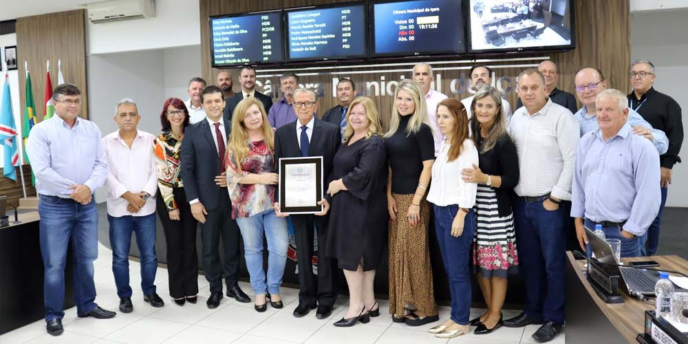 A rede Giassi de Supermercados recebeu moção de aplausos pelos 60 anos de atividades da Câmara Municipal de Içara na noite desta quarta-feira, dia 26. De autoria do vereador Israel Jorge Rabelo (MDB), a homenagem foi entregue ao fundador Zefiro Giassi. “Recebo do Legislativo que já tive a honra de representar no seu início. Lembrando como começamos, hoje é uma alegria ver que a semente plantada frutificou, pois estamos à altura das grandes cidades”, ressalta o empreendedor içarense.
