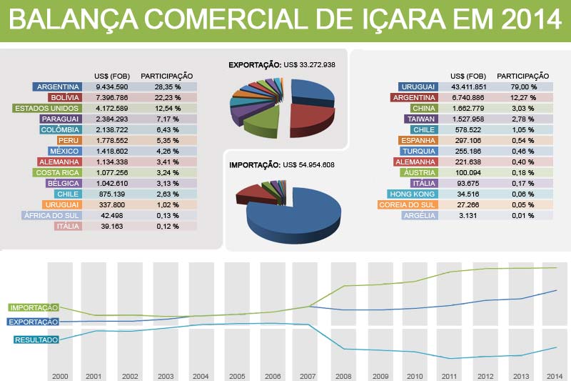Um novo recorde de exportação foi alcançado por Içara em 2014. O ano fechou com a somatória de US$ 33,2 milhões em produtos comercializados. O montante representa um acréscimo de 31,64% referente a 2013. O volume de importação também teve aumento. Subiu 0,78% e atingiu igualmente um novo patamar com US$ 54,9 milhões. Isto significa que a cidade teve um déficit de US$ 21,6 milhões. Foi o melhor resultado dos últimos seis anos. Os dados são do Ministério do Desenvolvimento, Indústria e Comércio Exterior.
