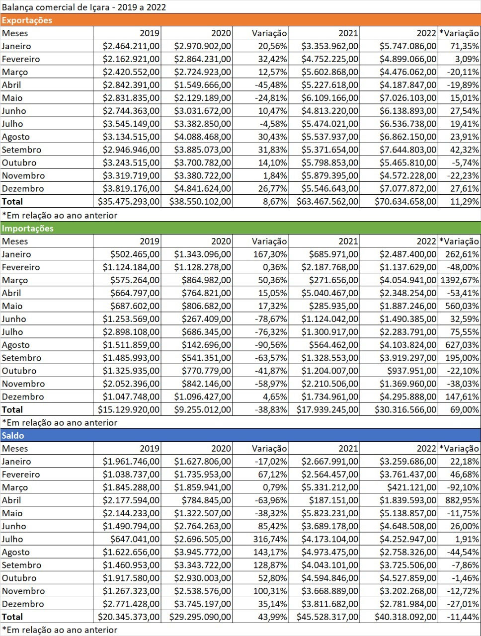 Devido à alta também no volume importado, o saldo da balança comercial de Içara em 2022 foi 11,44% menor em comparação ao superávit de US$ 45.528.317 registrado em 2021. No entanto, é quase o dobro dos US$ 20.345.373 apurados em 2019.
