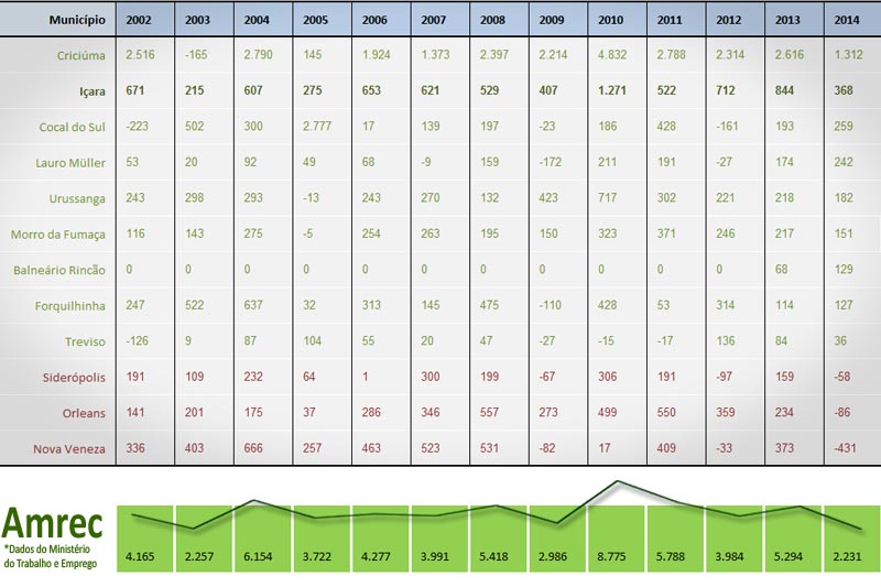 Içara criou 368 vagas de emprego em 2014. Foi o pior resultado desde 2005, quando a cidade contabilizou a formalização de apenas 275 trabalhadores. Apesar de o crescimento ter sido menor, o município ainda figura em segundo lugar na Região Carbonífera. Apenas Criciúma teve um resultado melhor com 1.312 vagas. Dentre as cidades da Amrec, três tiveram saldo negativo. É o caso de Siderópolis, Orleans e Nova Veneza.