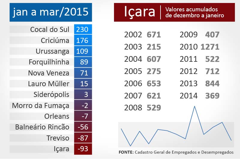 O primeiro trimestre não foi positivo para a geração de empregos em Içara. Afinal, a cidade teve 93 postos de trabalho eliminados. É o pior número na Região Carbonífera e o 10º maior déficit de Santa Catarina. À frente aparecem Bombinhas (-633), Garopaba (-452), Laguna (-389), Lebon Regis (-257), Balneário Camboriú (-169), Barra Velha (-131), Penha (-110), Capivari de Baixo (-105) e Imbituba (-97).