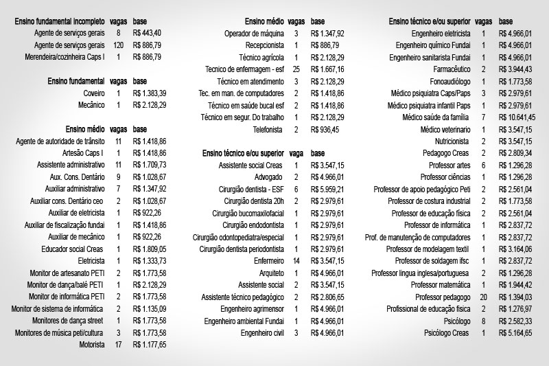 O concurso público possui 212 vagas ligadas às secretarias de Administração, Educação e Fundação do Meio Ambiente. Além disso, há 147 vagas para a Secretaria de Saúde e Assistência Social. A taxa de inscrição varia conforme o nível de escolaridade exigido. Nas funções que exige pelo menos o nível fundamental incompleto o valor é de R$ 50. Para cargos de ensino médio é de R$ 80 e de ensino superior de R$ 100. Os salários também possuem variação. O mais elevado é de R$ 10 mil.