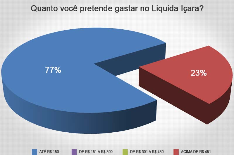Quanto você pretende gastar no Liquida Içara? Ao todo, 77% dos participantes da enquete realizada pelo portal indicaram que optarão pelo investimento de até R$ 150. Outros 23% manifestaram então que vão utilizar mais de R$ 451. O questionamento foi respondido entre os dias 26 de janeiro e 2 de fevereiro por 13 votantes.