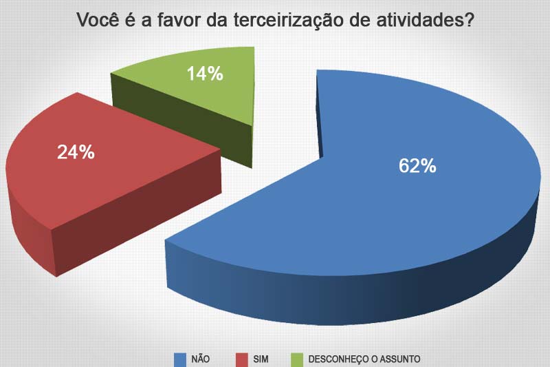 Para 62% dos internautas do Canal Içara a terceirização de atividades não deveria ser permitida. Outros 24% são favoráveis e 14% desconhecem o assunto. A pesquisa foi realizada com uma enquete na capa do portal de 13 a 20 de abril com 70 votos.