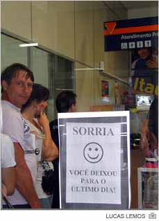 O desconto de 30% no Imposto Predial e Territorial Urbano (IPTU) gerou correria entre os contribuintes adimplentes nos últimos dias do benefício. Tanto que as filas ocuparam o hall do Paço Municipal durante toda esta segunda-feira, dia 14. A data foi o limite imposto por lei para o uso da cota única com abatimento dos valores. Fato curioso é que, em meio ao vai e vem de pessoas, chamou a atenção um cartaz no posto bancário do Itaú. Antes de ingressar na sala para o pagamento do boleto, o bom humor reinou numa advertência a quem deixou para os instantes finais: "Sorria. Você deixou para o último dia!".