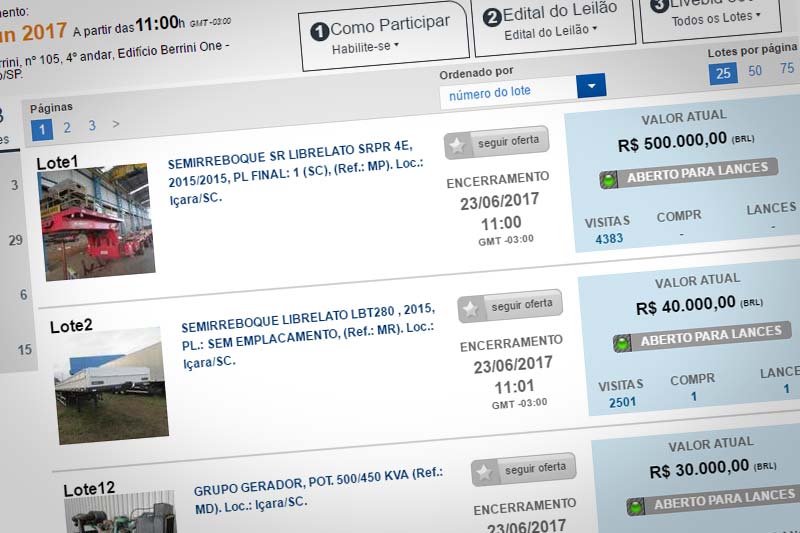 Os lances podem ser realizados por meio do portal Superbid [www.superbid.net] até sexta-feira, dia 23. Há equipamentos a partir de R$ 1 mil, por exemplo, prensas hidráulicas. Também é possível realizar lances presenciais na sede da companhia, em São Paulo, localizada na Avenida Engenheiro Luís Carlos Berrini, no quarto andar do Edifício Berrini One.