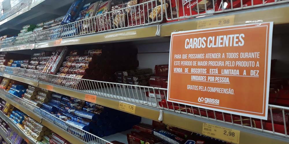 Na maior rede da cidade, o álcool gel permanece limitado a três litros por pessoa. Além disso, foram estabelecidas quantidades máximas por pessoa para a compra leite (36l); água (20l); café, massas e biscoitos (10und); arroz, farinha de trigo e açúcar (10kg); feijão (6kg) e até a maionese entrou na lista (6und).