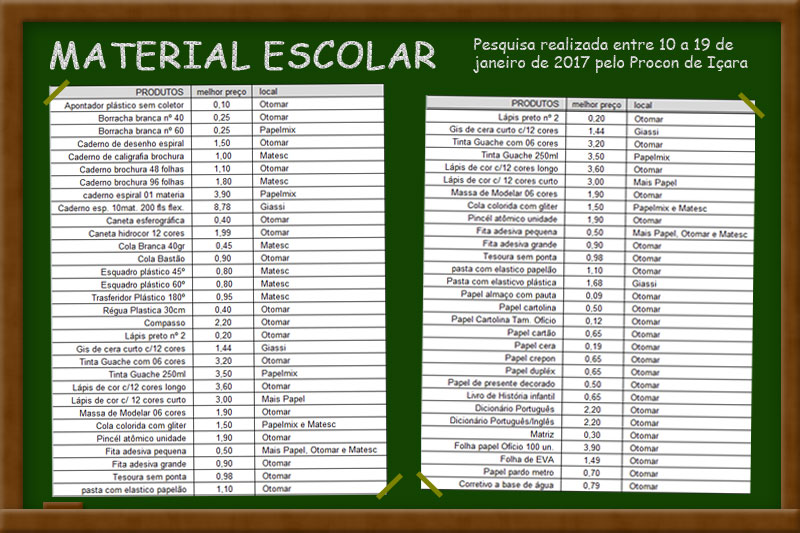 Conforme o órgão de defesa ao consumidor de Içara, os materiais escolares com preços mais acessíveis tiveram uma queda de 0,2% em relação ao último ano. A lista com 48 itens passou de R$ 68,67 para R$ 68,55. “Salientamos que as grandes diferenças de preços mostram que os pais precisam pesquisar bastante antes de comprar o material escolar dos filhos”, coloca a coordenadora Karoline Luiz Calegari Naspolini.
