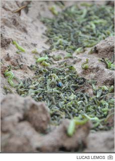 “Colocamos cinco armadilhas com feromônio em Içara para monitorar a reprodução. O hormônio serve de atrativo para estes insetos. Quando chegam aos equipamentos, eles ficam presos. Uma destas armadilhas coletamos nesta manhã e não havia lagartas. Vamos analisar o restante ao longo do dia”, coloca o engenheiro agrônomo da Epagri, Luiz Fernando Búrigo Coan.