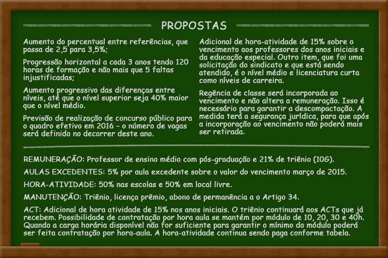 O Governo do Estado apresentou uma nova proposta para a carreira do magistério nesta segunda-feira, dia 13. “Atendemos a vários itens que foram levantados ao longo das 14 reuniões regionais que fizemos. Apresentamos a descompactação da carreira, que é o principal ponto dessa proposta”, garante o secretário Eduardo Deschamps.