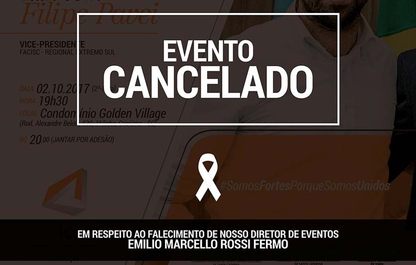 O Núcleo Jovem da Associação Empresarial de Içara deverá anunciar uma nova data para a talk com o vice-presidente regional da Federação das ACIs de Santa Catarina, Filipe Pavei. O evento na noite desta segunda-feira foi cancelado pela trágica perda do diretor de eventos Emílio Marcello Rossi Fermo. O luto foi manifestado em forma de nota assinada pelo coordenador da Ajei Kleiton Patrick de Alcântara Avi e o presidente da Acii Ramiro Cardoso nesta manhã.
