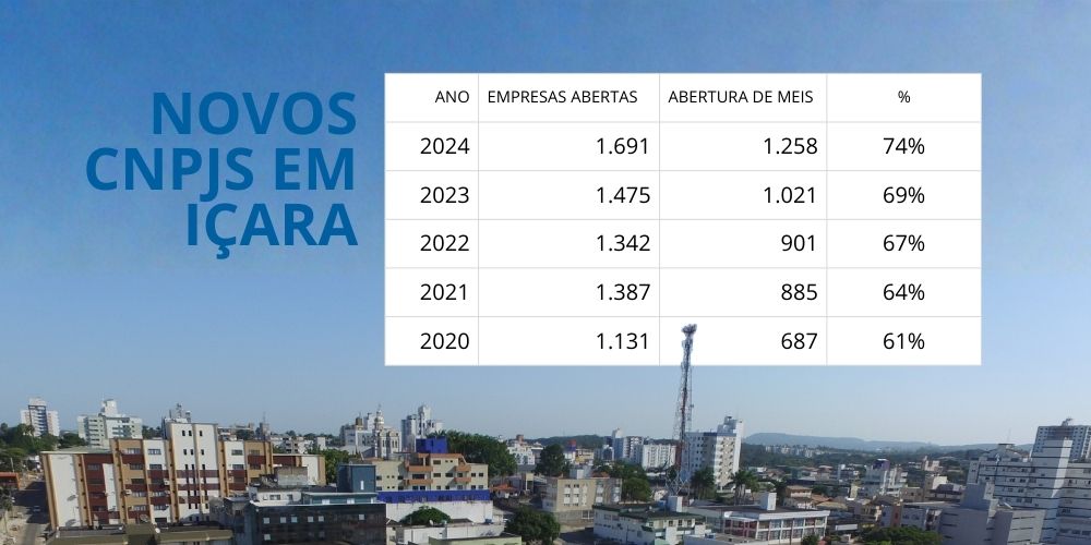 Desde a pandemia, o início de novos negócios vem crescendo ano a ano em Içara (a única exceção ocorreu em 2022, em comparação a 2021), o que resultou em crescimento de 63% entre o número de empresas abertas em 2020 e em 2025. Já o incremento entre os MEIs foi ainda maior no período: 112%, considerando a criação de 687 CNPJs no acumulado de 2020 e de 1.455 entre janeiro e novembro do ano passado.