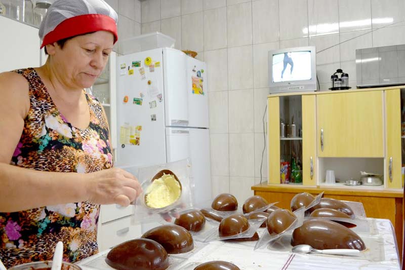 A Páscoa sempre é uma excelente oportunidade de negócios para muita gente que, de casa, faz e vende chocolates caseiros. A doceira Edna Máximo Batistello, de 54 anos, é uma dessas pessoas. São mais de oito anos na atividade. “Já tenho em torno de 150 encomendas até a Páscoa”, conta satisfeita.